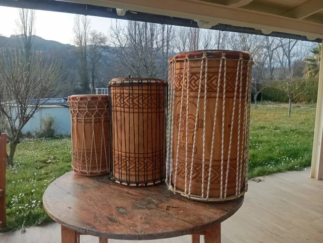 Detalles del productoConjunto de tres tambores profesionales de Guinea, un dum un Sangpan y un Kenkieni. Son instrumentos de percusión con un diseño tradicional.