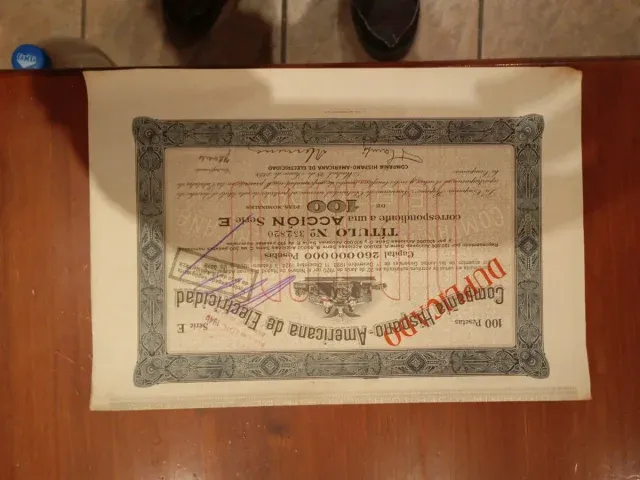 Detalles del productoDocumento de duplicado de acciones de la Compañía Hispano-Americana de Electricidad.