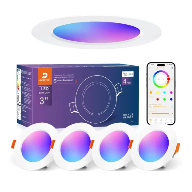 Detalles del productoPack de 4 luces LED empotrables de 3 pulgadas de la marca Dusktec. Son luces inteligentes que no requieren hub y funcionan con Alexa.Diámetro: φ91 mm; Orificio de corte: φ68-85 mm; Profundidad de techo requerida: 34mm; Voltaje de entrada: 200-240V.