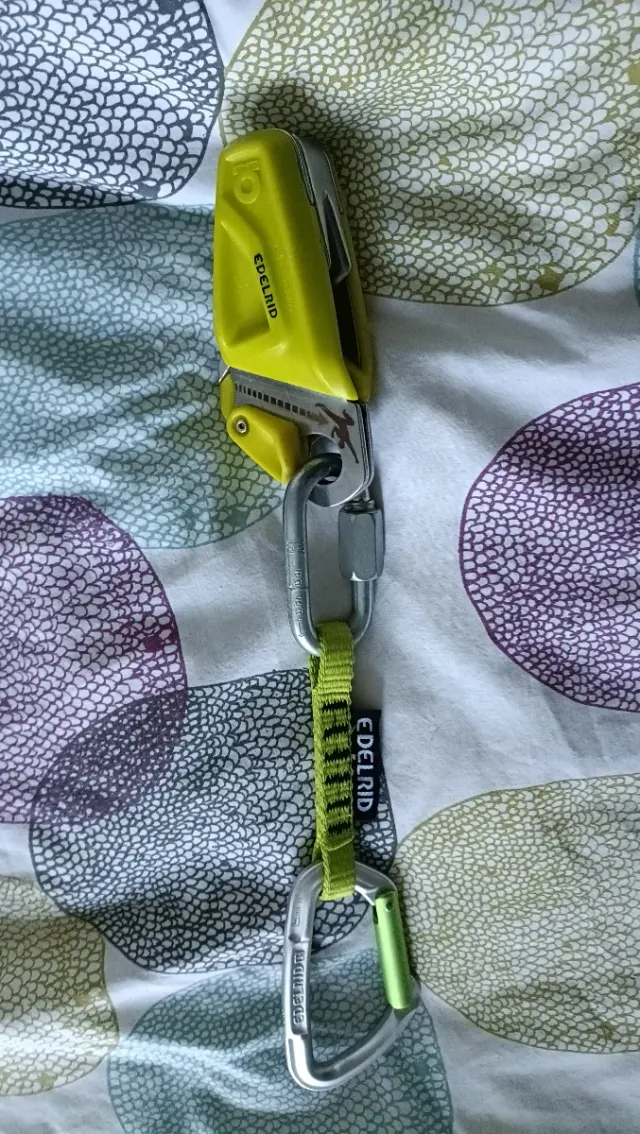 Detalles del productoDispositivo de frenado asistido Edelrid Ohm en color amarillo y gris. Incluye mosquetón y cinta.