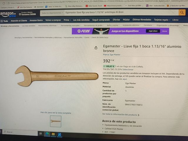 Detalles del productoEgamaster llave fija una boca 1.13/16" antichispa Aluminio- bronce nueva sin uso. Puedo mandar fotos o vídeo.