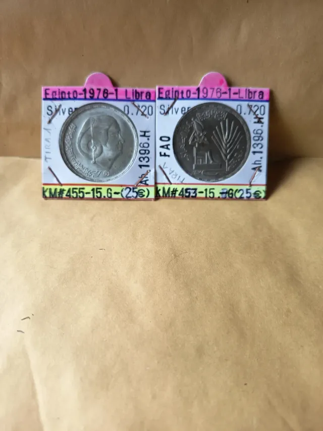 Detalles del productoConjunto de dos monedas de plata de Egipto de 1976, cada una con valor de 1 Libra.