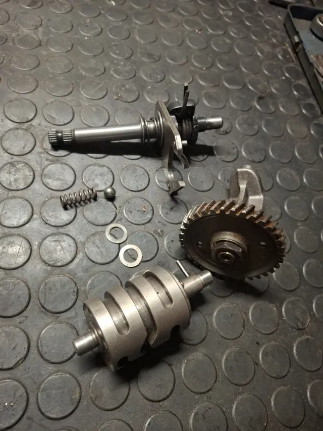 Conjunto de eje selector de caja de cambios y balance, junto con un muelle y una bola. - Eje selector de caja de cambios. - Eje de balance. - Muelle. - Bola.