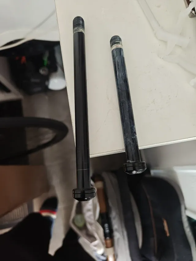 Dos ejes pasantes para ruedas de bicicleta de carretera. - Color negro. - Material metálico.