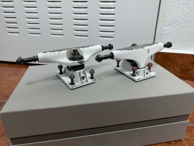 Ejes de skate de la marca Nomad, diseñados para tablas de 7,75 pulgadas. - Color blanco con detalles desgastados. - Incluye tornillería.