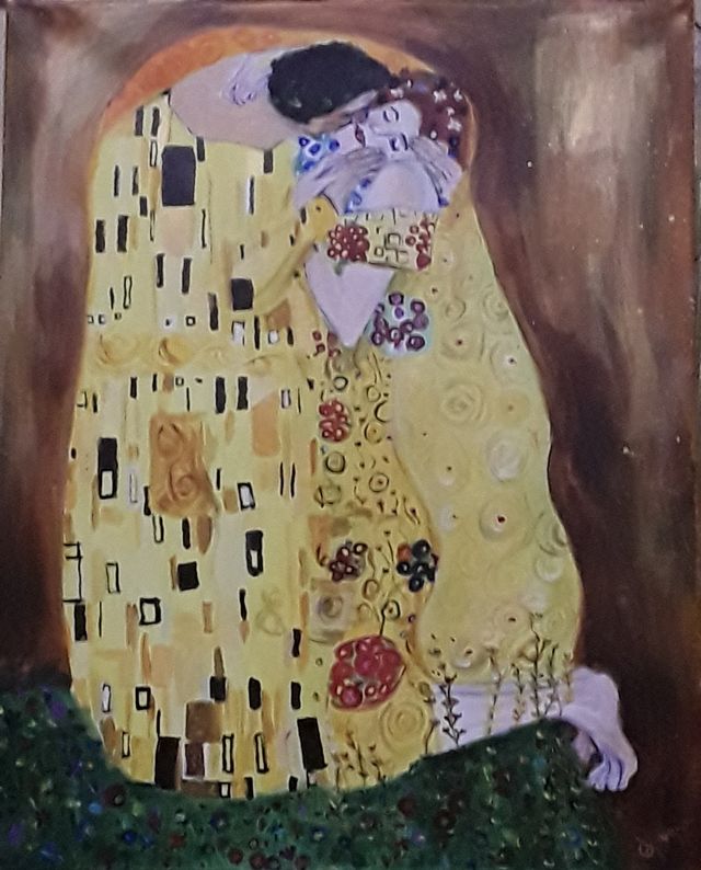 Detalles del productoReproducción pintada a mano de la famosa obra El Beso de Gustav Klimt. Una pieza única que captura la esencia del Art Nouveau.