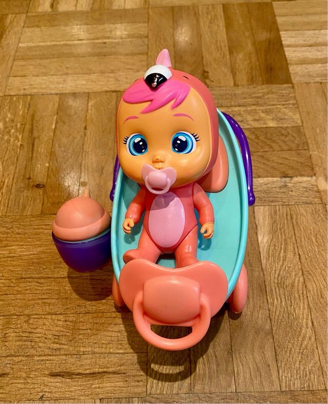 Incluye el carrito mágico, el personaje exclusivo Fancy (Bebé Llorón Lagrimas Mágicas), 1 chupete, 1 biberón.