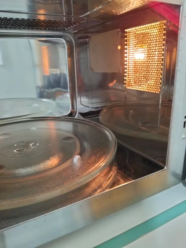 Detalles del productoMicroondas de acero inoxidable con plato giratorio de cristal.
