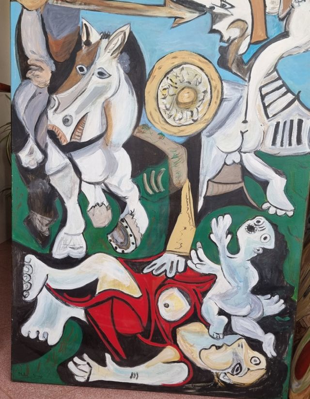 Reproducción de la obra El rapto de las sabinas de Picasso. - Pintura al óleo sobre lienzo. - Estilo cubista. - Representación dramática de figuras y animales.