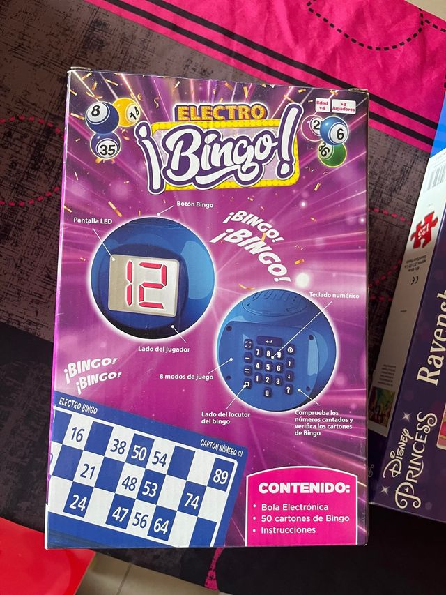 Detalles del productoJuego de Bingo electrónico para toda la familia. Incluye una bola electrónica que canta los números y verifica los cartones.