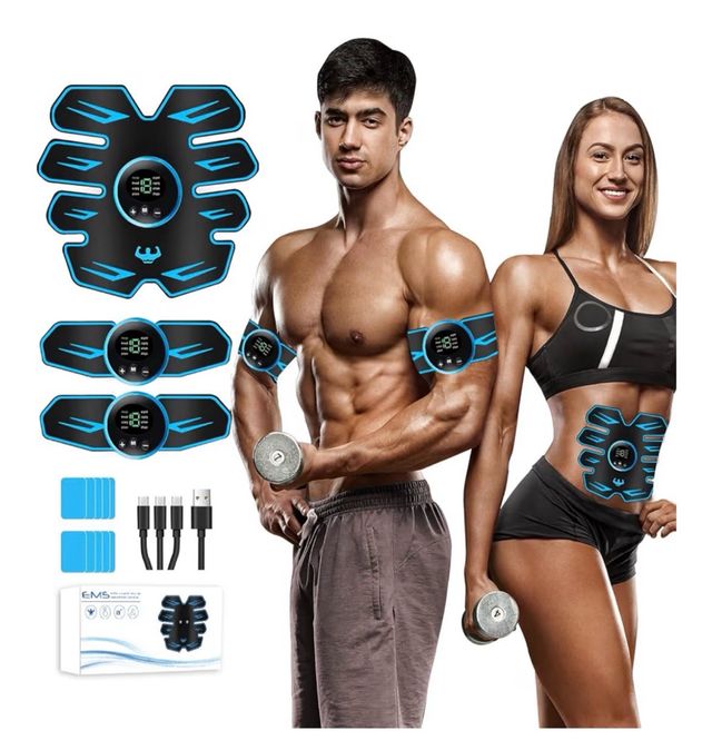 Detalles del productoKit de electroestimuladores EMS para tonificar músculos. Incluye almohadillas para abdomen y brazos, además de accesorios de carga.