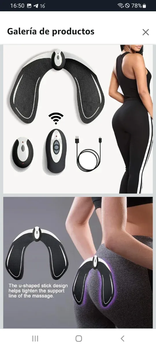 Detalles del productoElectroestimulador muscular con diseño en forma de U para glúteos.