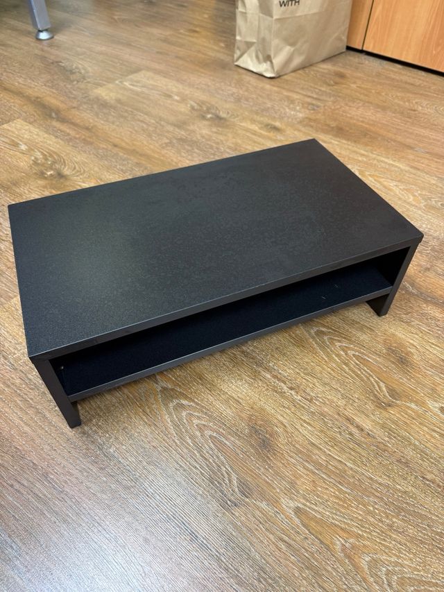 Soporte elevador para monitor o portátil, ideal para organizar tu espacio de trabajo. - Color negro. - Diseño moderno y funcional. - Dos niveles de almacenamiento.