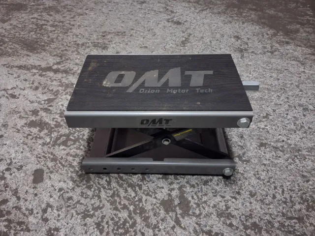 Elevador mecánico para motos de la marca OMT. - Modelo Orion Motor Tech. - Estructura metálica resistente. - Plataforma superior con superficie antideslizante.