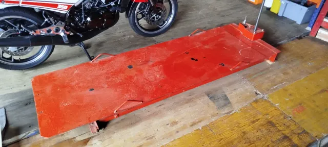 Plataforma elevadora de color rojo para motos. Se sube con un taladro a batería. - Construcción robusta. - subida y bajada por husillo