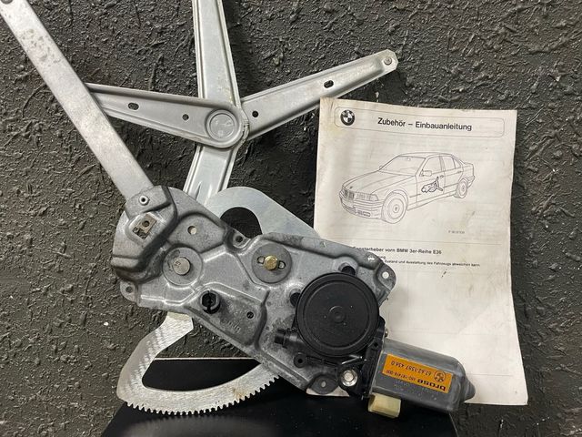 Componente para elevalunas delantero de BMW Serie 3. - Mecanismo de elevalunas. - Motor eléctrico. - Instrucciones de instalación.