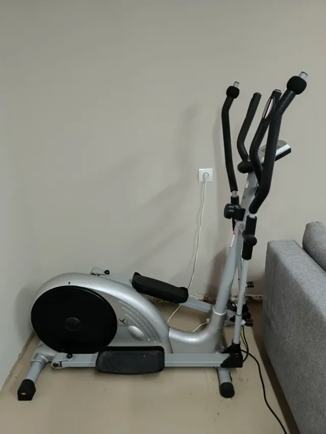 Detalles del productoElíptica de color plateado, ideal para entrenamientos en casa. Su diseño compacto la hace fácil de integrar en cualquier espacio.