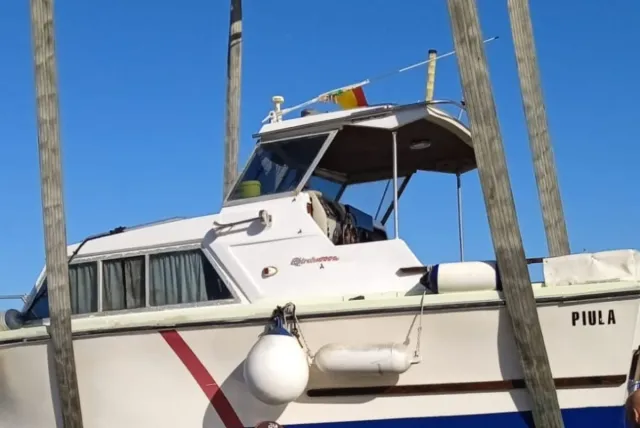 Embarcación lista para navegar. - Nombre: PIULA - Bandera española visible en la parte superior.