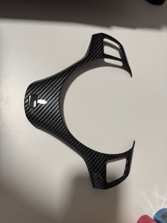 Embellecedor para volante con acabado en fibra de carbono. - Diseño deportivo y elegante. - Material resistente y duradero. - Se adapta al volante M.