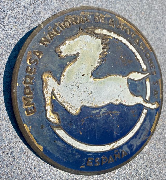 Detalles del productoPreciosa insignia metálica antigua de la Empresa Nacional de Autocamiones (ENASA). El emblema muestra un caballo rampante sobre fondo azul y dorado. Se encuentra en buen estado, considerando su antigüedad, aunque presenta señales de desgaste y óxido.