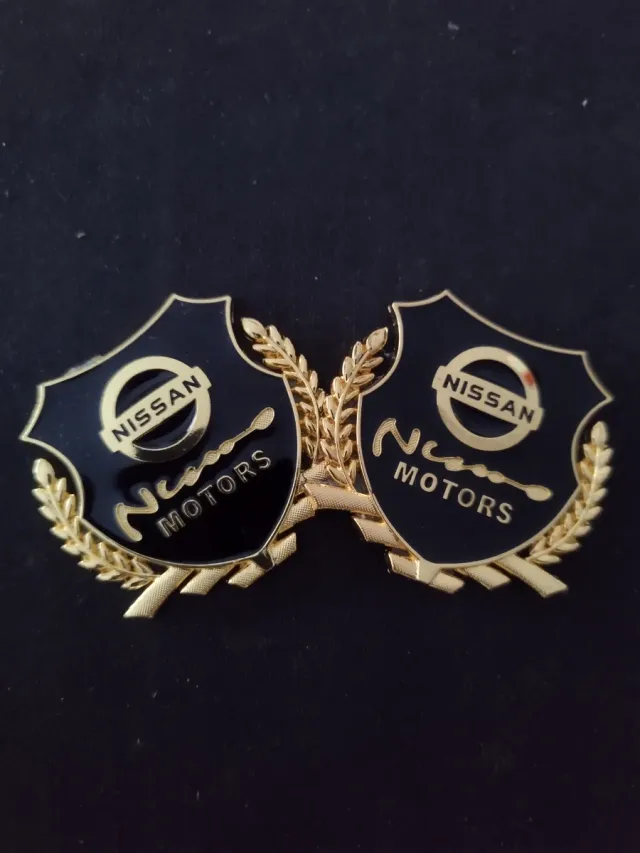 Set de dos emblemas decorativos para Nissan Motors. Añaden un toque distintivo a tu vehículo. - Diseño tipo escudo. - Acabado en negro y dorado. - Incluye laureles dorados.