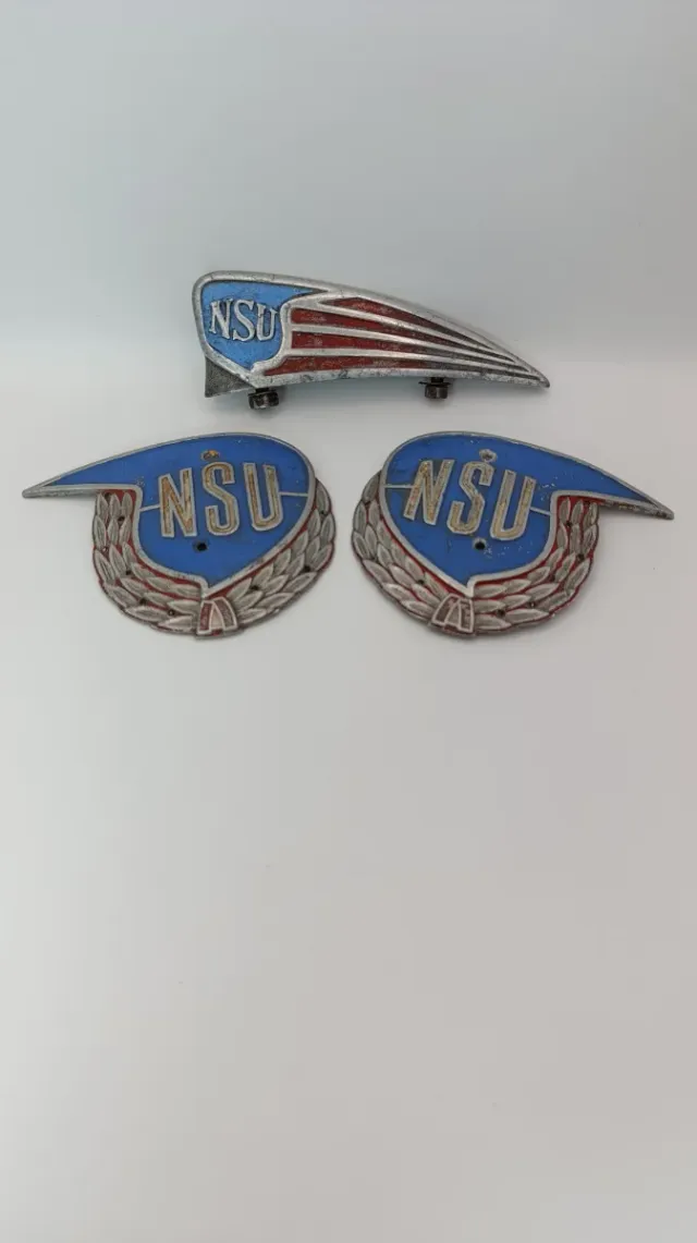 Detalles del productoPiezas para expertos coleccionistas del mundo del motociclismo. Conjunto de tres emblemas antiguos para motocicleta NSU, modelo Lux Max Superfox.