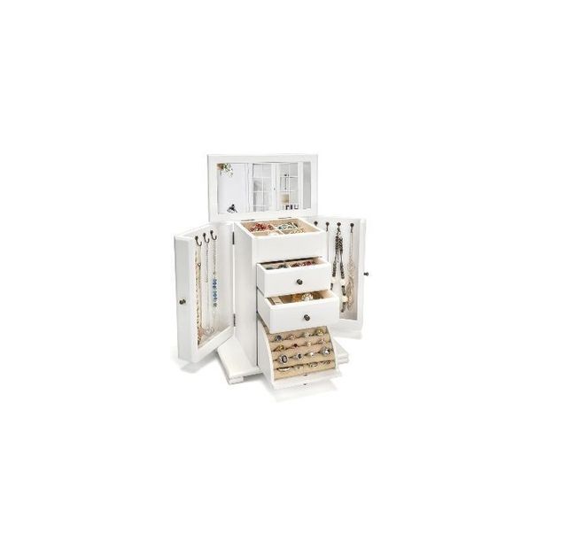 Emfogoo Joyero, almacenamiento de joyas, de madera rústica, grande, organizador con espejo, 4 niveles para anillos, pendientes, collares, pulseras (blanco desgastado)