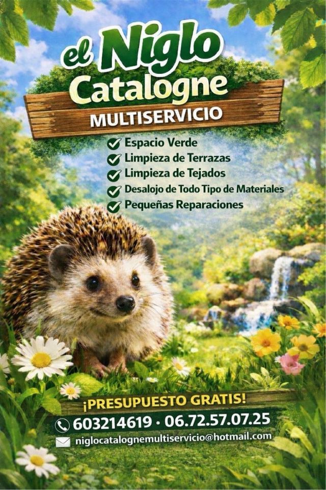 Hola, les ofrezco los servicios de Niglo Catalonia Multiservice. Nos encargamos del cuidado de sus zonas verdes, la limpieza de terrazas y tejados, la recogida de todo tipo de residuos y pequeños trabajos de bricolaje. No duden en contactarnos.