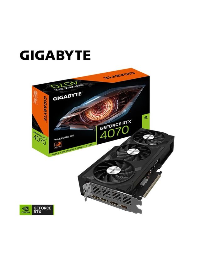 Detalles del productoTarjeta gráfica Gigabyte RTX 4070 en color negro.