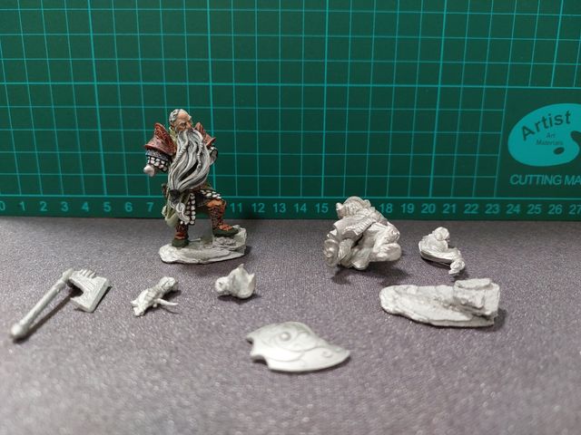 Detalles del producto2 enanos guerreros, iguales, uno pintado y el otro sin pintar al que le falta algunas piezas. De la casa Andrea Miniatures. De metal. 50mm.