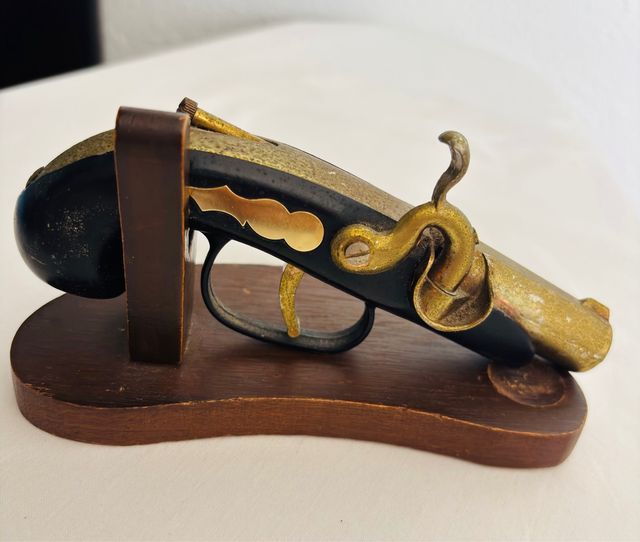 Encendedor con diseño de pistola antigua, ideal como objeto decorativo. - Base de madera. - Detalles dorados y negros. - Mecanismo de chispa