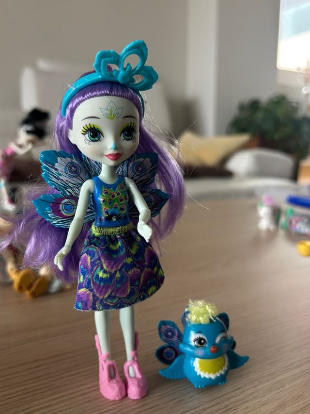 Set de muñeca Enchantimals Patter Peacock con su mascota Flap. La muñeca tiene el pelo morado y alas de pavo real.