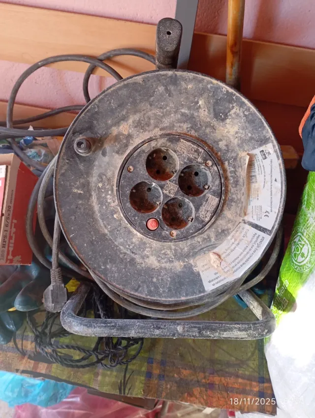 Alargador con cuatro tomas de corriente y cable enrollable. - Tambor para enrollar el cable. - Asa para transporte. - Interruptor de seguridad.