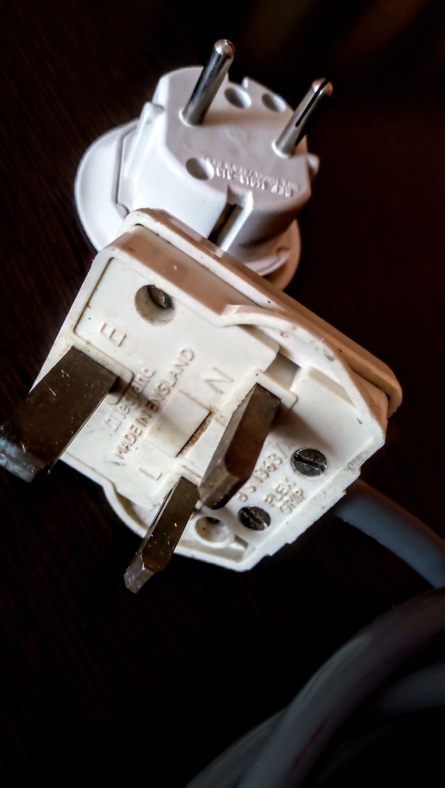 Detalles del productoAntiguo cable con adaptador enchufe de toma inglesa UK Reino Unido a Europea España con fusible en su interior para proteger equipos informáticos, audio o vídeo antiguos retro vintage.