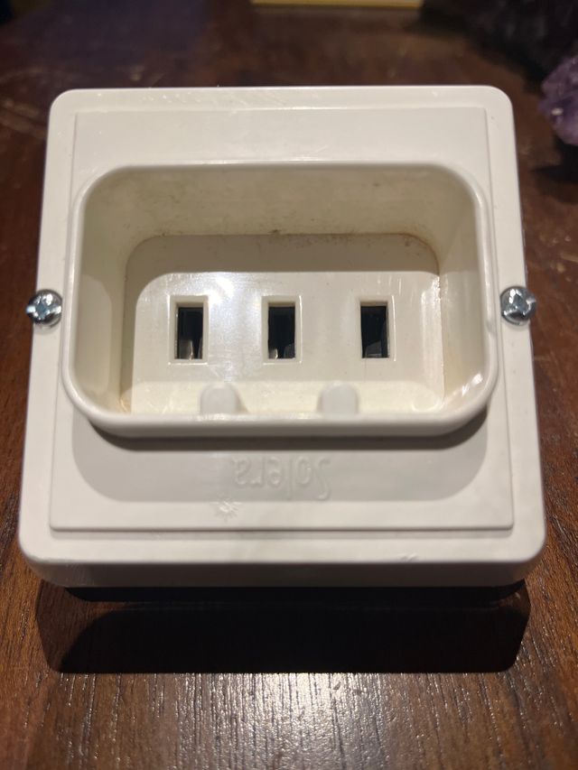 Enchufe de superficie con tres orificios para clavijas planas. - Diseño de superficie. - Tres orificios para clavijas planas.