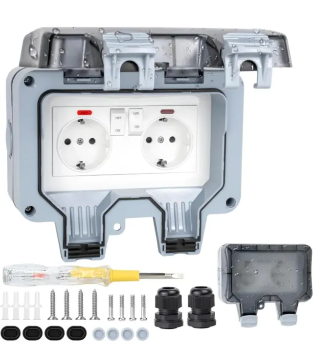 Detalles del productoCaja de enchufe doble para exterior con protección contra el agua. Incluye accesorios para su instalación.