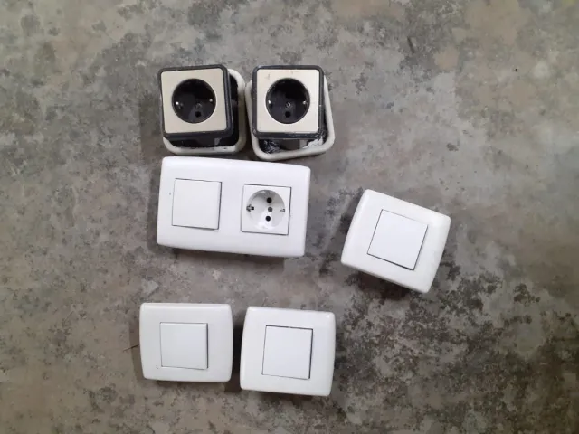 Lote de enchufes e interruptores de diferentes modelos. - Dos enchufes - Un enchufe e interruptor con marco doble - Tres interruptores individuales con marco
