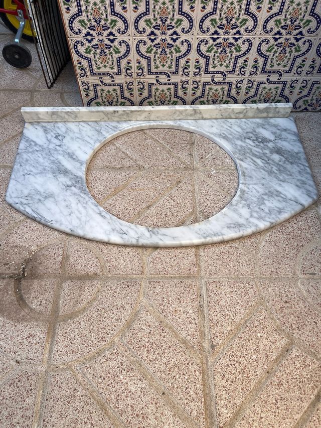 Detalles del productoPreciosa encimera de mármol para baño, de forma redonda. Es de color blanco veteado.