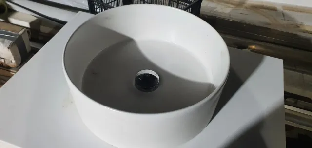 - Lavabo redondo de cerámica blanca.