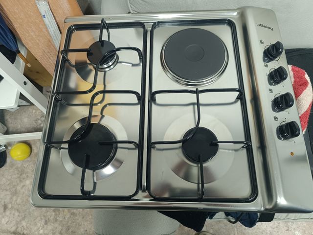 Detalles del productoEncimera de cocina Balay con tres fuegos de gas y una placa eléctrica