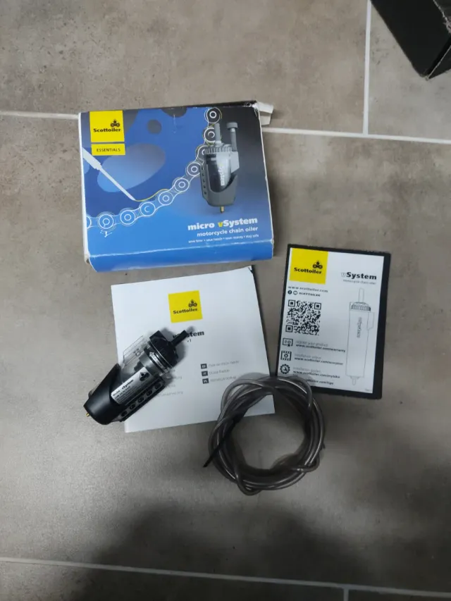 Detalles del productoSistema de engrase automático Scottoiler micro uSystem para cadena de motocicleta. Incluye el depósito, la manguera y las instrucciones.