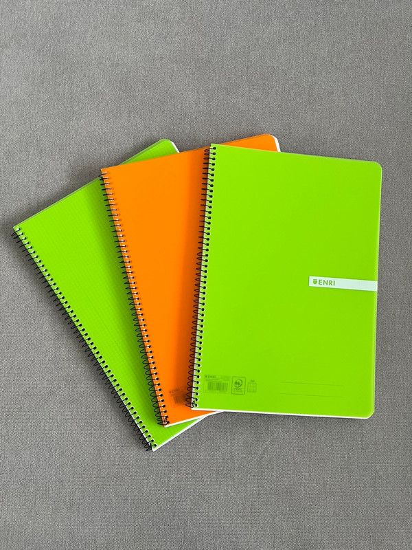 Detalles del productoLote de 3 cuadernos ENRI cuadriculados 4 mm x 4 mm. Tapas de plástico en color verde y naranja. 80 Hojas. A uno de ellos le falta la primera hoja. Medidas: 21,5 x 31 cm (Un poco más grande que el A4).