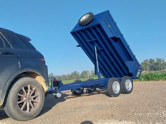 Remolque basculante de color azul con doble eje y freno. Ideal para transporte.