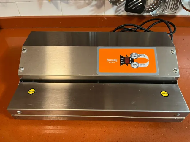 - Panel de control con funciones 'Seal', 'Stop', 'Vac/Stop', 'Manual'.