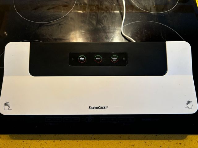 Envasadora al vacío de la marca SilverCrest, en excelente estado. - Diseño moderno en blanco y negro. - Panel de control con indicadores luminosos.