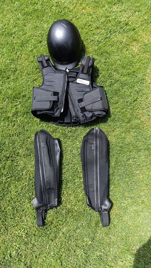 Detalles del productoConjunto de protecciones para equitación infantil en buen estado. Incluye un chaleco protector, un casco y un par de polainas. Ideales para principiantes.