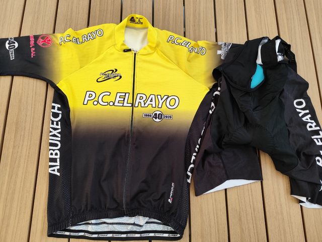Detalles del productoSe vende equipación ciclista en buen estado. Incluye maillot y culotte. El maillot es de color amarillo y negro, con detalles en blanco y rojo. El culotte es negro con detalles en blanco. Perfecta para tus salidas en bici. - Talla: consultar la foto de la etiqueta del maillot. - Incluye maillot y culotte. - Diseño elegante y deportivo.