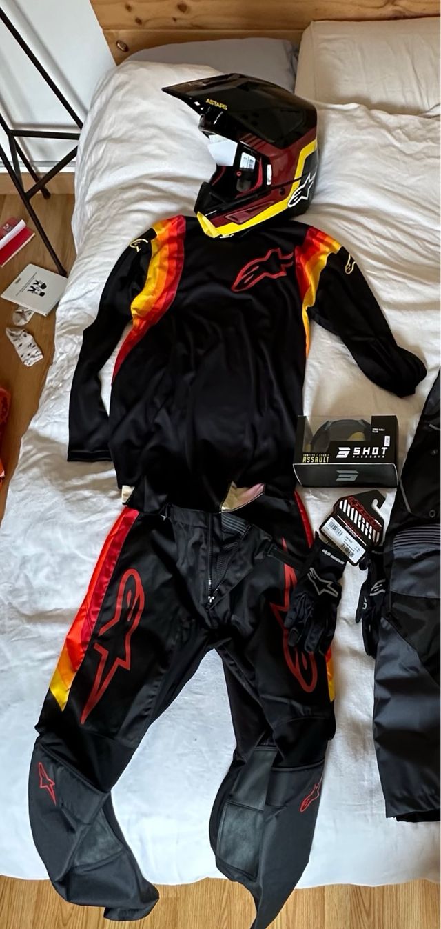 Detalles del productoVendo equipación de enduro y trail. NO SE VENDE POR SEPARADO. Un solo uso de media hora. Las prendas son una equipacion completa de Alpinestar a conjunto pantalon (L) camiseta (L) y casco (XL) comprada en Motocard. Regalo gafas Shot sin uso.