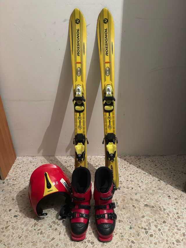 Conjunto de esquí para niños, ideal para iniciarse en este deporte. - Esquís Rossignol amarillos. - Botas de esquí rojas. - Casco de esquí rojo.