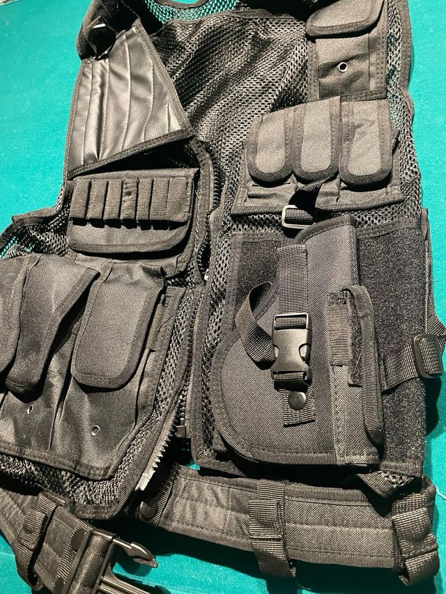 -Chaleco de camuflaje con muchos detalles para guardar lo necesario.